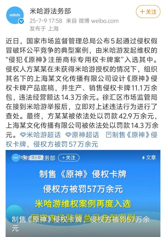 新浪科技讯 7月10日上午消息配资股票平台,米哈游法务部昨日发文称,国家市场监督管理总局公布了一批侵权假冒典型案例,其中“侵犯《原神》注册商标专用权卡牌案”入选。侵权人方某某未经许可,组织设计、生产并销售侵权卡牌产品,非法使用“原神”“GENSHIN IMPACT”“枫原万叶”等注册商标。自2023年6月起至案发,方某某共生产侵权卡牌4031盒,共计11.1万余包,通过电商平台销售,违法经营额达14.3万余元。